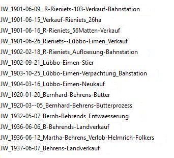 Zu den jeweiligen Lagen einer ehemaligen Wohnstätte sind die Namen der Eigentümer oder Bewohner interessant. Diese habe ich weitgehend durch Suche in den Anzeigen im Jeverschen Wochenblatt (JW) gefunden. Es wird dabei aber manchmal nicht deutlich, ob es sich um die Eigentümer oder Pächter der Hof- oder Häuslingsstellen handelt. Auch ist damit ein lückenloser Bewohnernachweis nicht möglich.